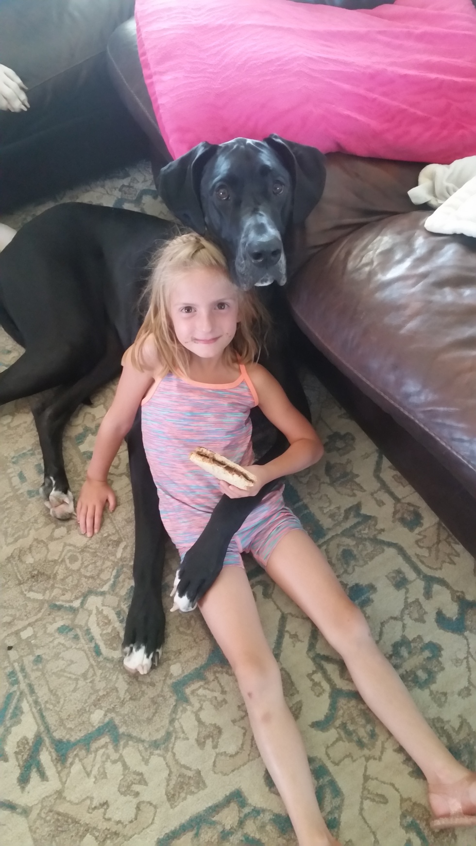 Meet Pitch! She never sings off key, is blacker than tar, and is always selling the idea that there is time for a walk. No, she is not a labrador, you can tell because there is still a sandwich in the picture. Best breed ever, the Greatest of Danes, Pitch.