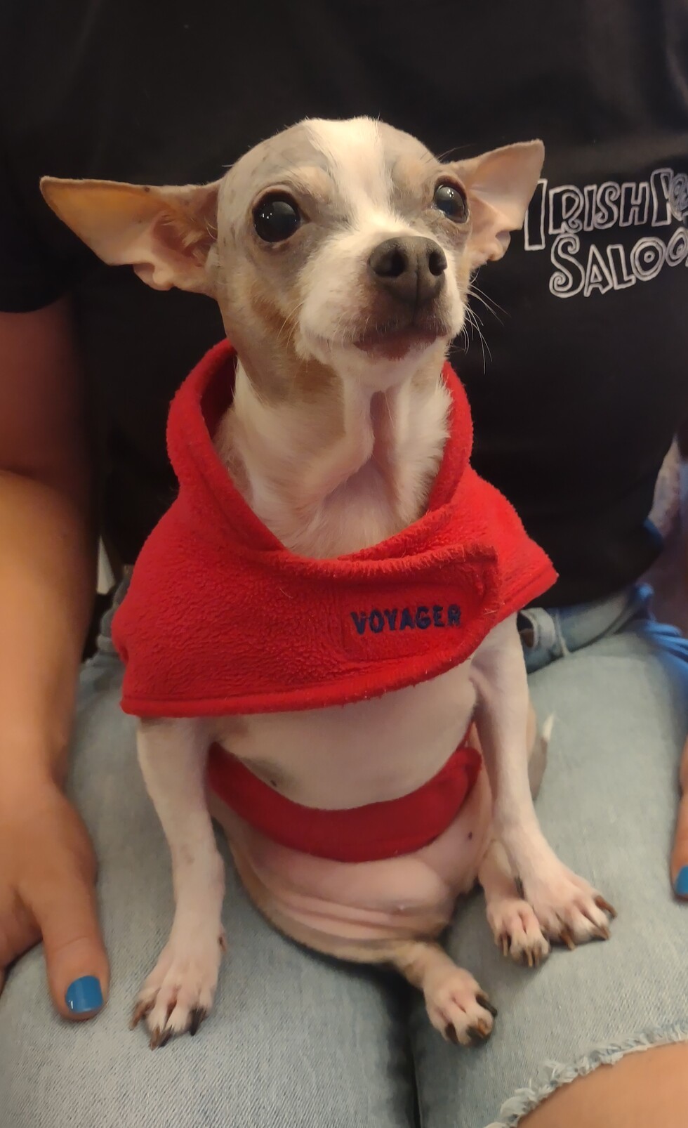 Potato the (mostly) Hairless Tornado has pigment alopecia which really just means she has a fierce mohawk and a smooth backside. She enjoys snacks (but don't feed her after midnight), short walks on level terrain that isn't too dirty or wet, and a nice warm sweater!