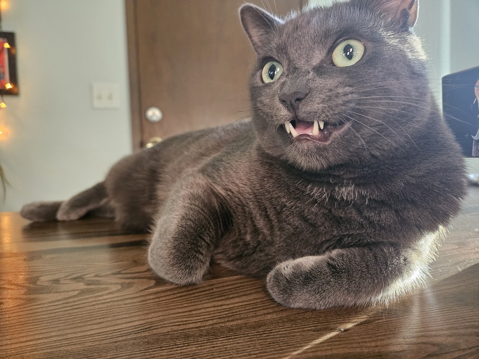 Ike was born a feral barn cat at a dairy farm, and despite being a big boy, can only squeek in a tiny little voice!