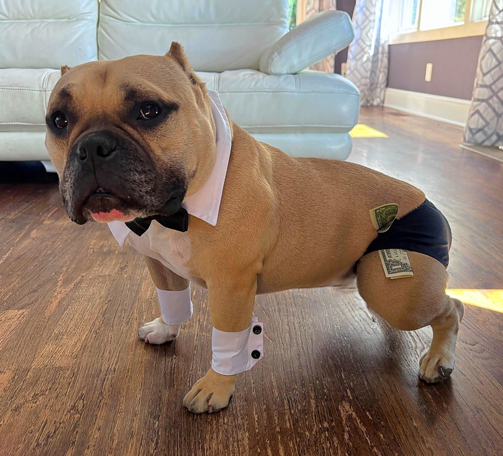 Flex is an American Bully rescue from Riverdale Animal Shelter. He, and his brothers, were rescued from a hoarding situation, and he’s now living his best life as a natural comedian and cuddle bug, warming the hearts of everyone he meets. So much so, he has made friends everywhere and he has “crash pads” all over the metro area anytime he wants to visit them! He loves every holiday because he knows people are visiting, but he especially enjoys dressing for Halloween because of all the attention he adores.