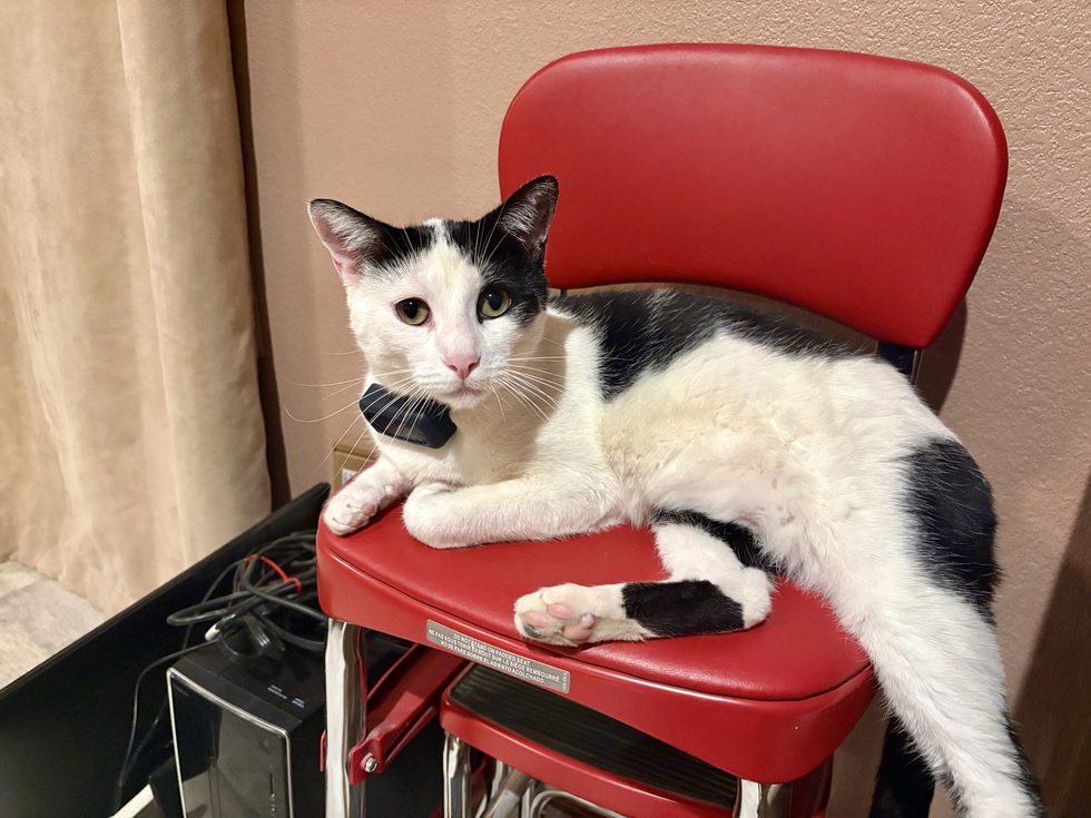My silly boy, loves chasing the red dot! Purrs super loud and is a love bug.