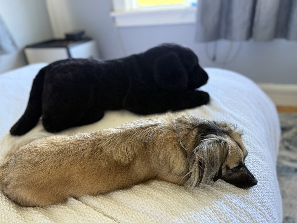 Sweet but shy, Maple enjoys walks to the beach to check out the squirrels and chasing the cats from the back yard. She also likes hanging out with her toy sibling.