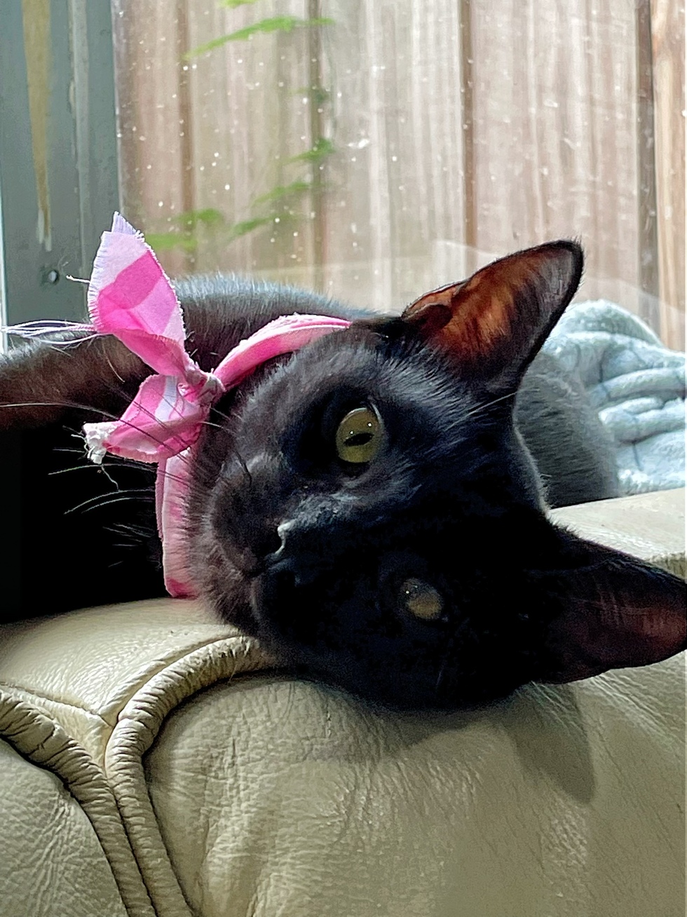 Delta (originally known as String Bean) is the sweetest kitten. She has one partially blind eye, but that doesn’t slow her down a bit! She is a total mama’s girl, and follows me everywhere. She’s also a sneaky lady, and steals the most random items (receipts, business cards, a bag of screws, a silk blouse) and carries them in her mouth and stashes them in her little cat cabin. She loves wearing her pink bandanna and looking her best, and resting in the window and basking in the sunlight. She likes to be held like a baby and gives so many kisses.