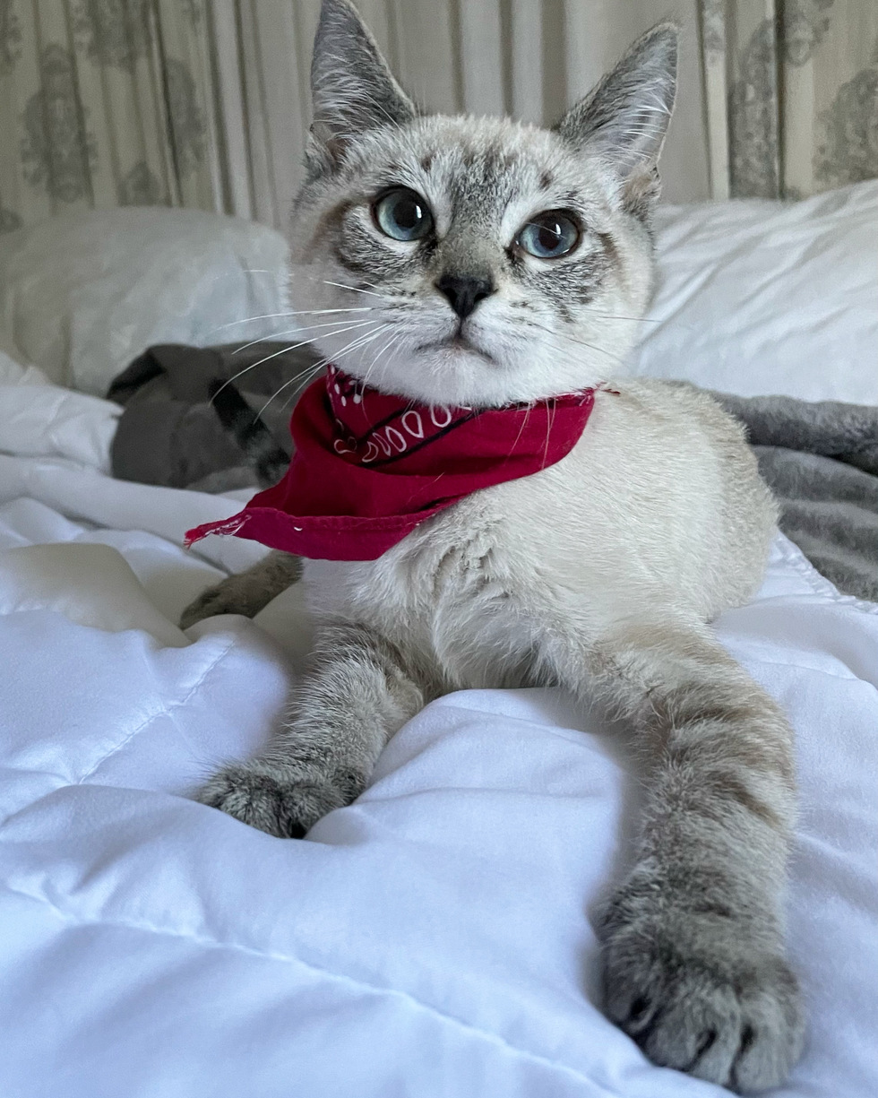 🤍Kioshi aka Shi Shi, was adopted through Abandon Pet Rescue. He was found trapped in a building severely dehydrated. He is a Siamese Tabby. Very independent, a little timid but super ferocious when it comes to play time. Fetching his crunchy ball is his favorite obsession. He loves to sleep under the covers and watch tv.