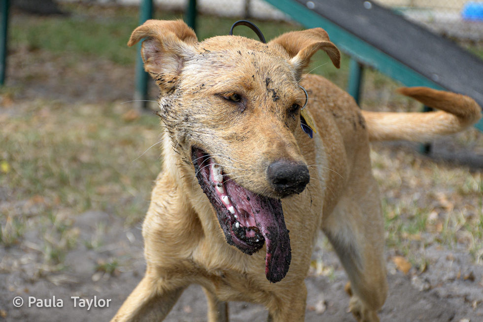 Sunshine loves to play in the park with other dogs. Running, rolling and eating dirt and playing in water are her favorite things. She greets her fellow playmates and their owners with her friendly personality. This photo was caught after digging in the dirt and then running to meet a new playmate at the dog park in Coral Springs.