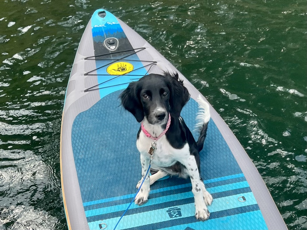 Junebug has come a long way from her first outing on the paddle board in July, which landed both of us in the drink! Nowadays she hops on even before I have a chance to put on her life jacket, and her balance is great. With summer coming to a fast end in Montana, we can’t wait to see what this little adventurer thinks of snow sports!