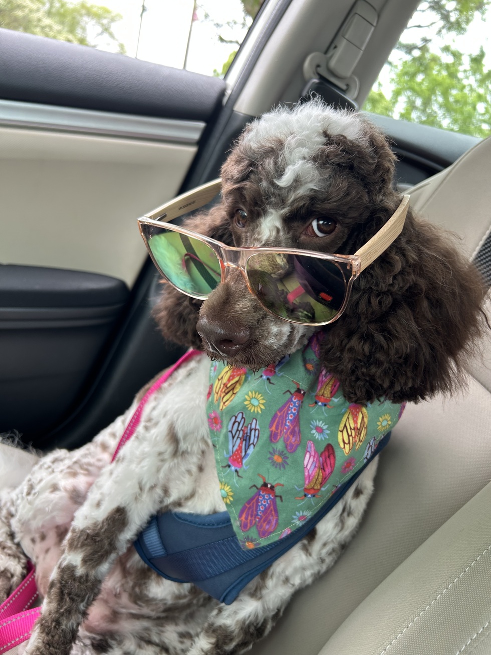 Daphne is Setter Poodle aka Pooter. D not only stands for Daphne but also Diva, and Dinner Lover. Serving looks after a groom is her second favorite hobby after sitting for treats.