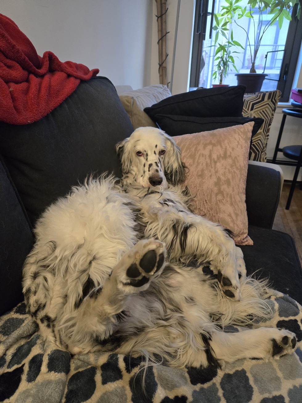 Alfie is a sweet girl, but a little greedy when it comes to belly rubs! In this photo, that is just what she is waiting for! She wants to play with every dog she sees outside and also loves getting pets (& mini massages) from humans!