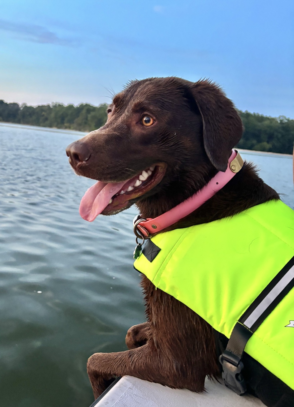 This is our beautiful 4. 1/2 yr old chocolate lab, Belle. She’s a Wonderful girl now, but the 1st yr and a half, she was quite a handful. As you can see, she lives for boat trips, or the pool.