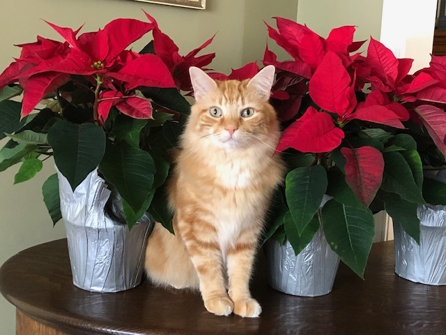 A little about me...Rocket J. Squirrel (aka Rocky from Rocky and Bullwinkle) was adopted when he was 3 years old. We intended to get a kitten but he won our hearts over instantly when we visited the animal shelter. He has a fluffy tail and loves to zoom around the house, hence his name fits him perfectly! Rocky is an indoor cat. He's very affectionate and is happy his favorite human works from home. He enjoys watching birds, squirrels and rabbits from our screened in porch and has escaped several times by clawing holes in the screen. He has also been known to sneak out the door if you're not paying attention. Thankfully he always come back! He loves Christmas and waited for us to take his picture with the poinsettias. He knew he was looking good!