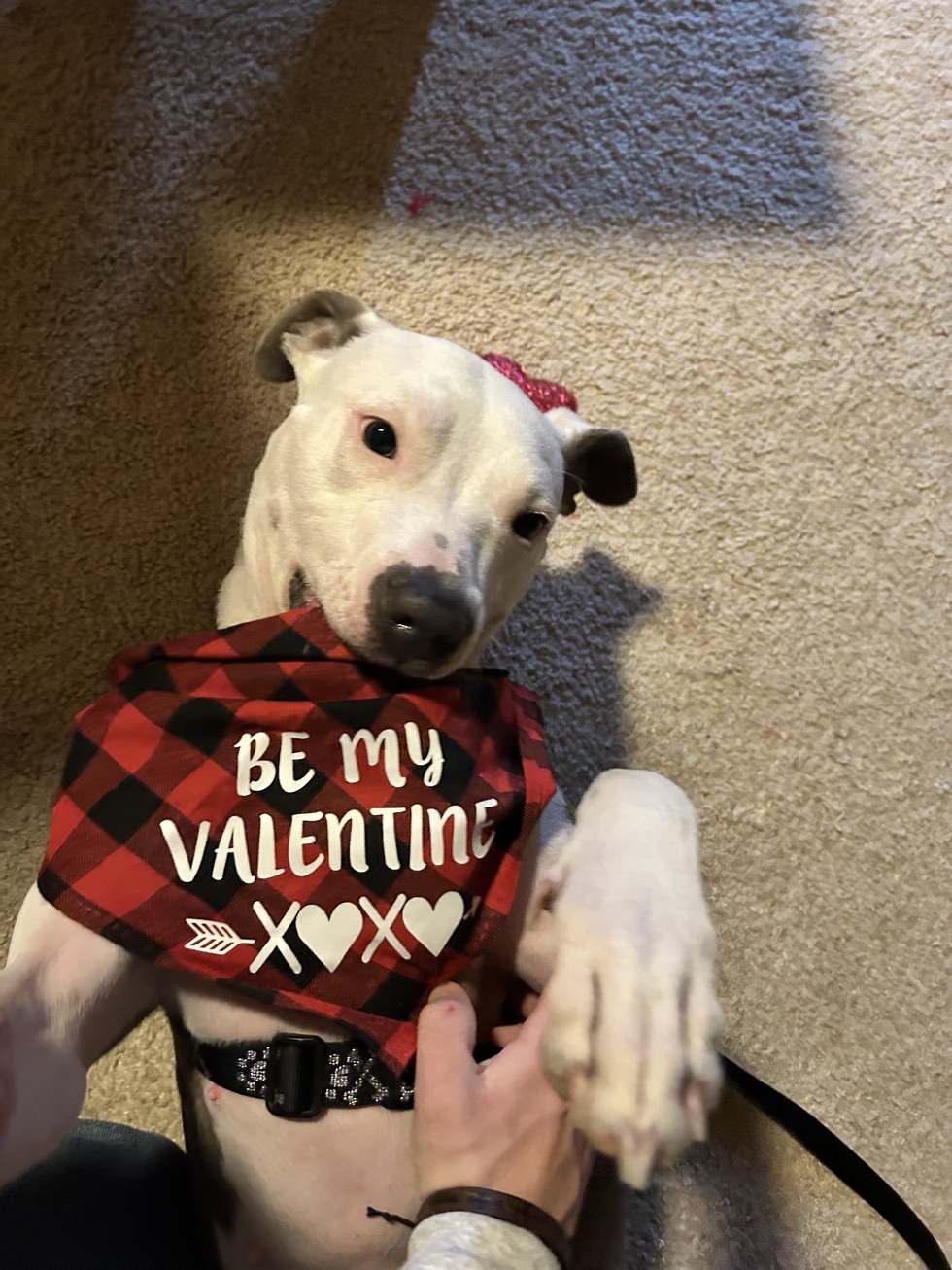 A little about me...I adopted Daisy (Formerly known as K Soufflé prior to adoption) from the Kent county shelter and she has been the light of my life. She loves people, she loves dogs, and ESPECIALLY loves squirrels! She’s my cuddle buddy every night in a bed that’s too big for me so she fills that’s space. She lives a happy cage free life where she follows me everywhere I go and has an unlimited amount of treats of all different kinds. She as you can tell wore the costume to ask my lady to be my valentine this year. She brings love to everyone she sees.
