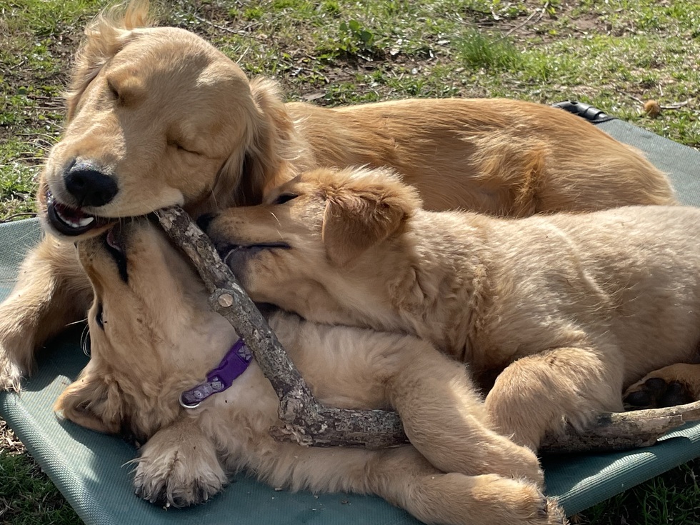Ruffian turns out to be a natural mother to all her pups. Here she shows daughter Daisy and son Theo how to share a yummy stick.