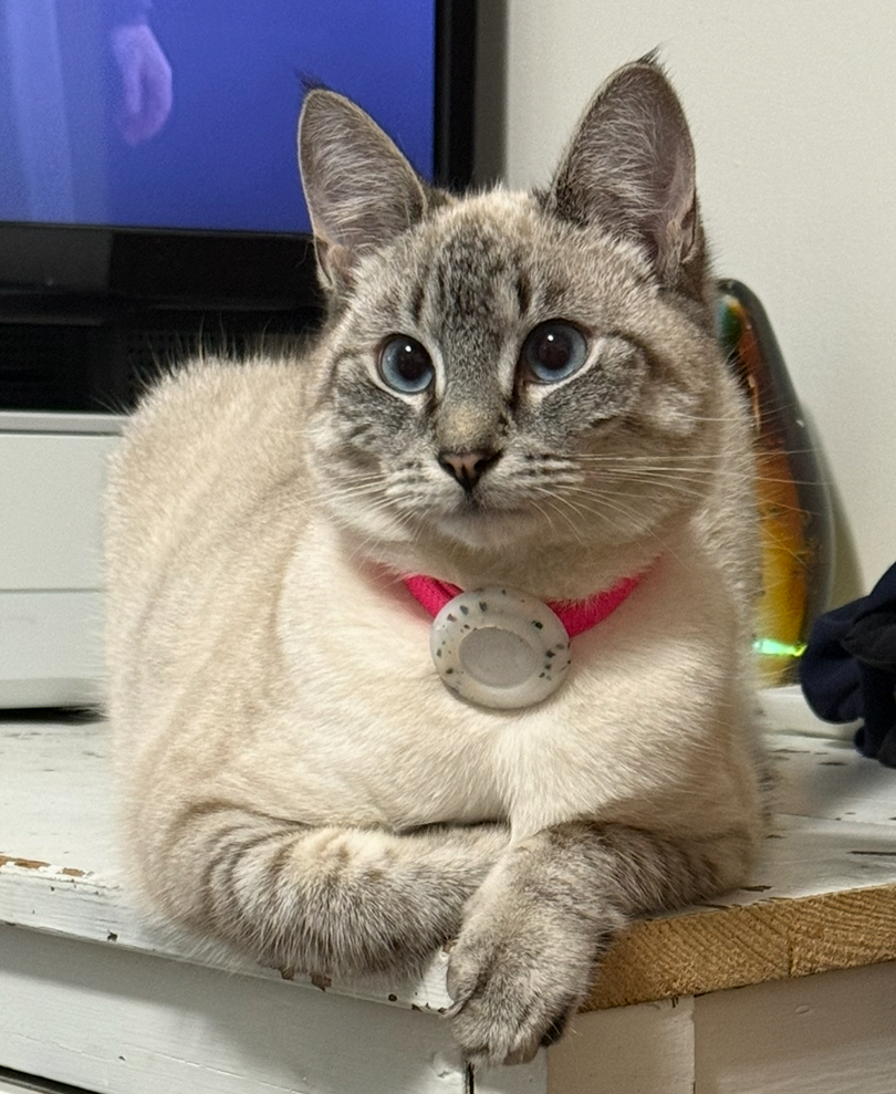 With her gorgeous bright blue cross eyes, she's absolutely stunning. Right here, she's staring me down, semi-patiently waiting for dinner. Named after Hedwig, the snowy owl from Harry Potter