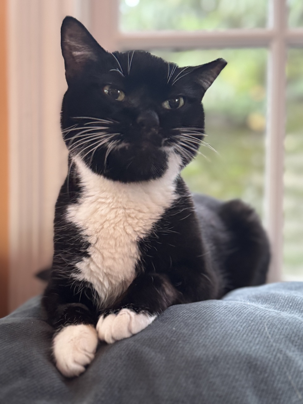A little about me...We were so lucky to have Boots join our family this year after ACSKC took such great care of him. He is an 8 year old with two teeth, velvet fur and a giant heart who gently follows us through the house and leans in for head scratches. Always a staff favorite at the vet, Boots has survived health challenges and loves curling up in an open suitcase, window sill or desk to keep you company. Whenever any of us arrive home, we look to find him right away and make sure he gets plenty of pets and opportunity to purr away.