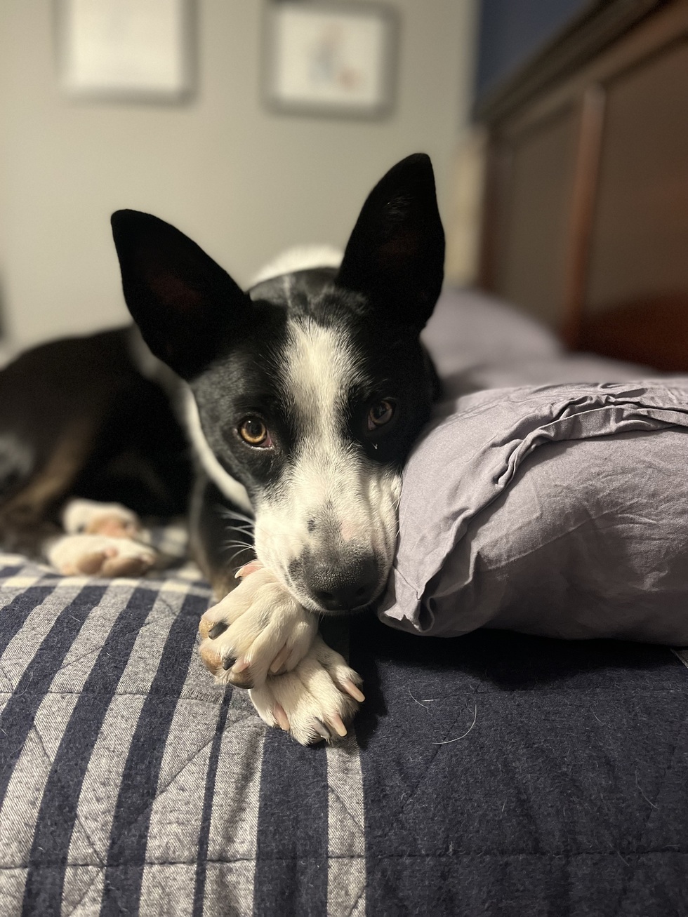 Quinn was adopted by me and my husband a year ago as of August 2nd. She is Miss Quinn and Princess Quinn and so much more. She loves to go on walks, hike, do agility, and especially eat cheese. She is very sweet and gentle. She especially loves belly rubs.