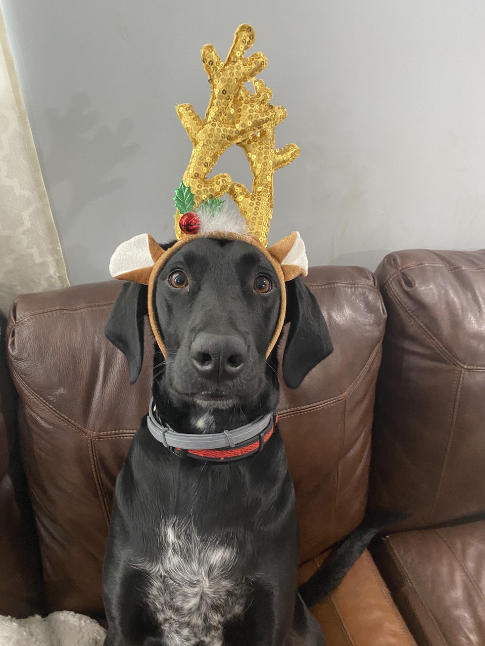 We adopted Charlie (previously Van) from Kelley in February of 2019. He has been the perfect addition to our family. He is constantly making us laugh and smile. He loved wearing these antler ears so we figured we would submit a photo.