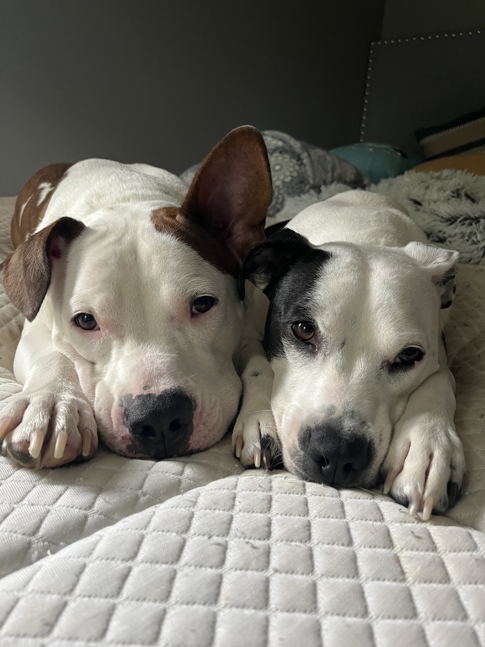 Kona (originally Jean, which we kept as her middle name) came to us first in 2021 as a puppy from adopt a stray. She was my first pup ever. We loved watching her grow but felt she needed a buddy. Our cats had each other and didn’t want much to do with playing with her and she seemed bored. We weren’t actively looking but I would continue to check adopt a stray until one day Maui (then Hank) popped up and we fell in love!! We decided since he was good with dogs and cats he was a perfect fit. He was a little over a year and definitely had been through some sort of trauma but each day he has gotten better and finally is realizing this is his forever home. Maui and Kona have become the best siblings and love each other lots. We are so happy that our fur baby family is now complete.