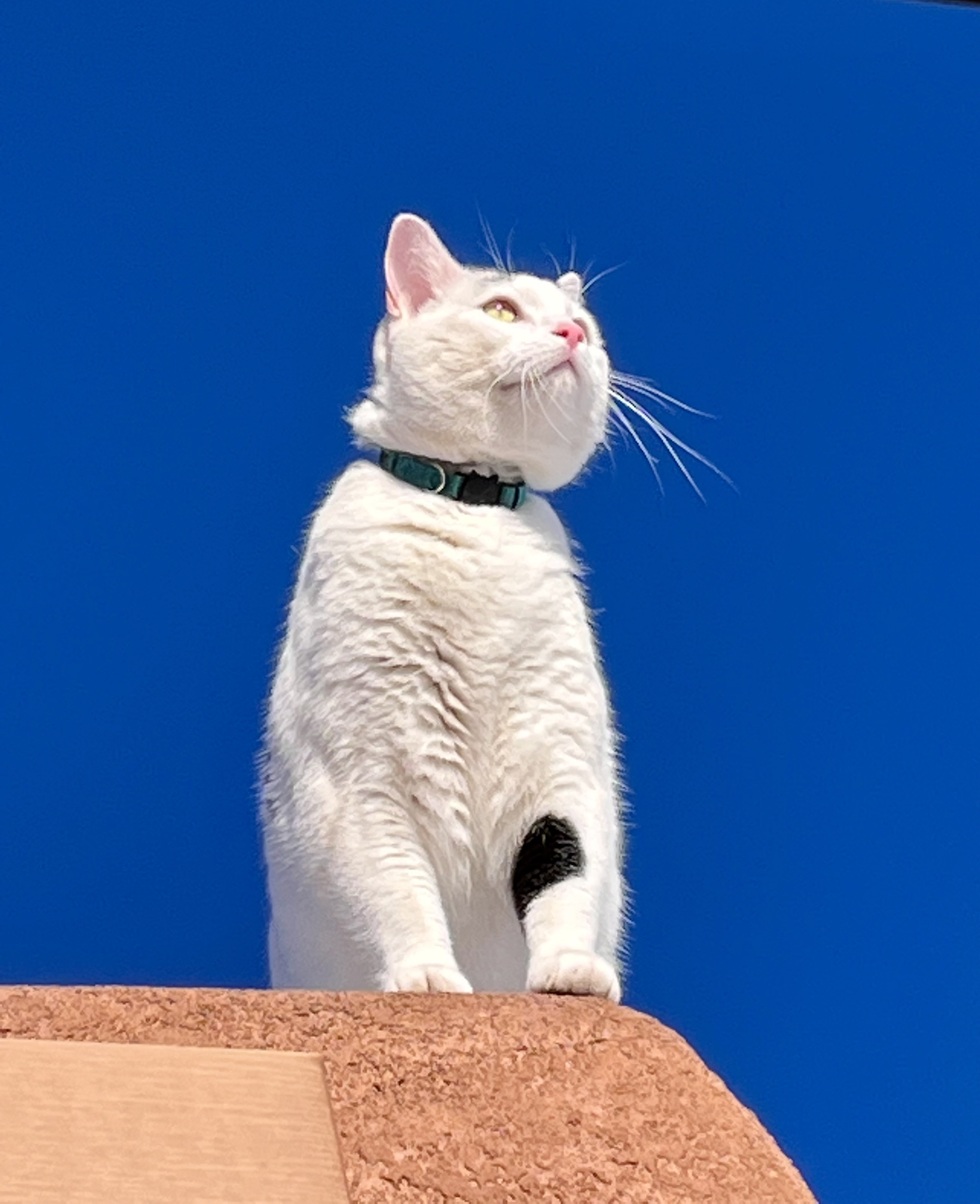 Kailua was adopted during Covid from Stray Hearts Animal Shelter in Taos, New Mexico. This picture was taken at our home in NM where we had a typical adobe style house and Kailua and her sister loved the vantage point from our flat roof.