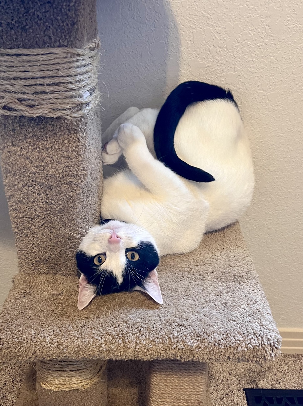 Hana and her sister Kailua were adopted from Stray Hearts Animal shelter in Taos, New Mexico during Covid. She is loving, playful, ornery and loves tummy rubs and upside down views!!!