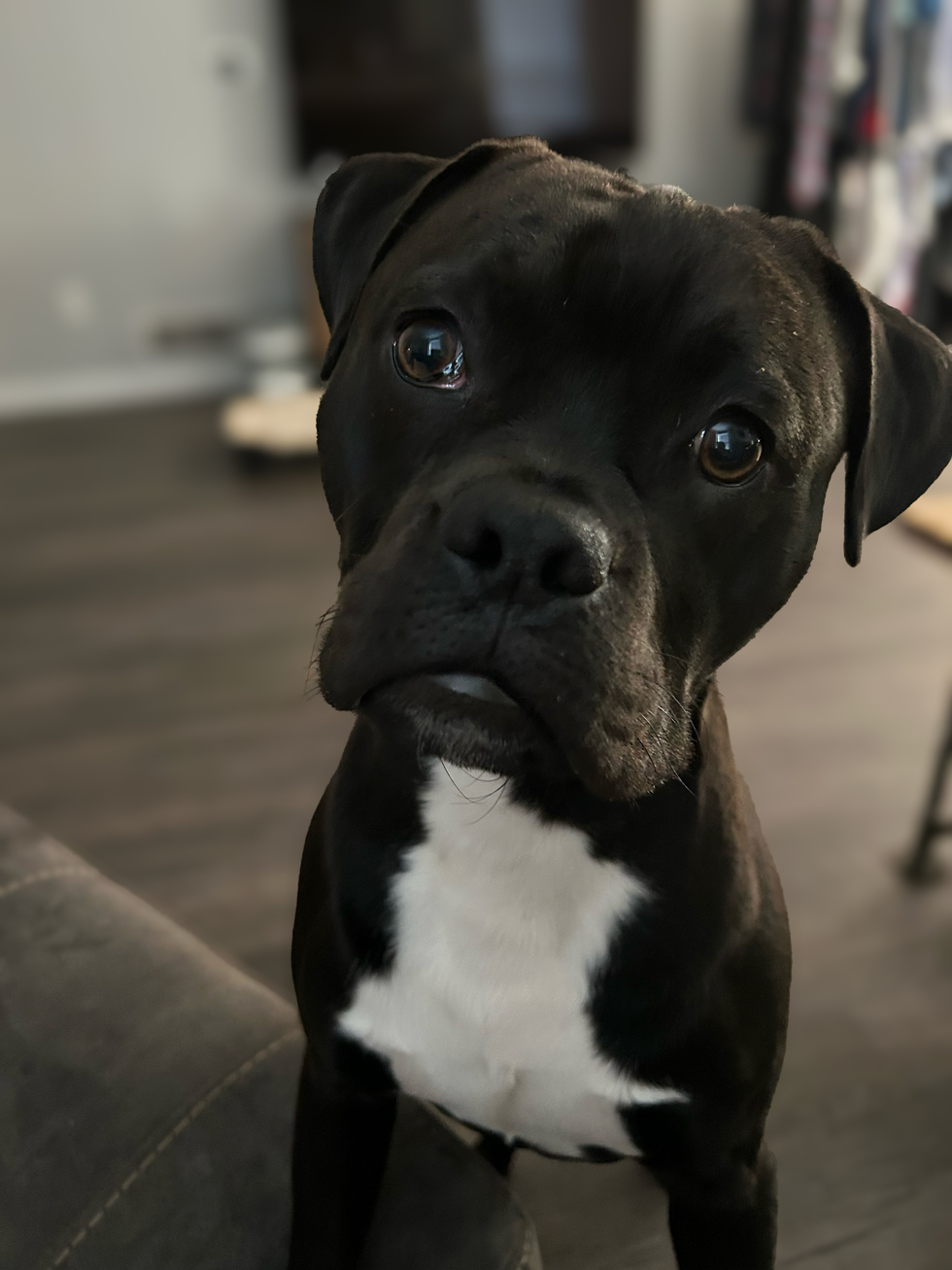Hi, I’m Quint — a 1‑year‑old pug–pit mix with rescue‑pup roots, a wiggly little body, and a heart that basically runs on love and treats.