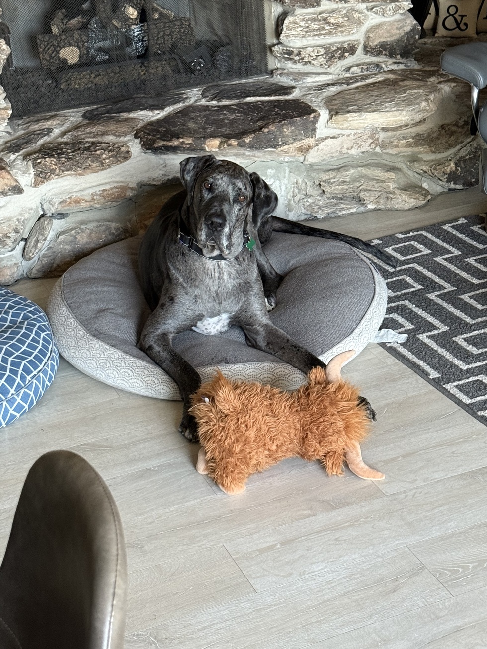 Truman is a lovable 185lbs Great Dane who came to us last year. His favorite things to do consist of sleeping, walks, dinner time and his toys. He ALWAYS has a toy in his mouth and carries them everywhere he goes, unless of course he’s eating or giving kisses. He is the absolute sweetest dog, always gentle, will greet anyone and craves pets from any and everyone he meets. His personality is pure gold, so calm and the true definition of a gentle giant!