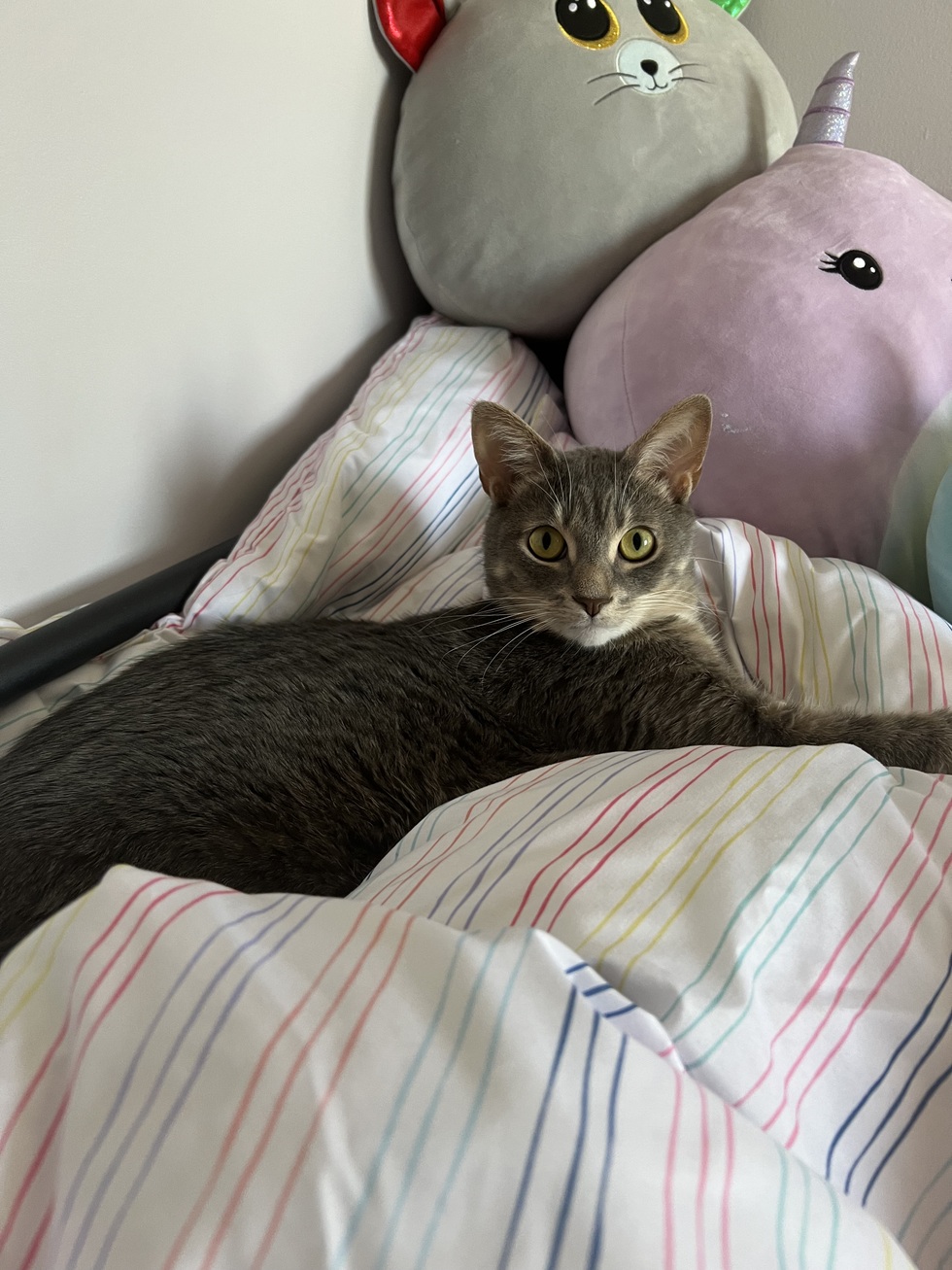 A little about me...Cosmo is a rescue kitty that we found through an Aldi Facebook group! I knew it was meant to be from the moment I saw his little face in that post. His eyes reminded me so much of our cat we had just lost to cancer. Cosmo is a friendly, playful, cuddly kitty who loves to eat treats! We have two children who love to play with Cosmo and they often sneak him extra treats when mom and dad aren’t looking. He can most often be found next to our sons high chair during any mealtime. He is the perfect addy to our family and we hope to see his adorable face represented for such a great cause!