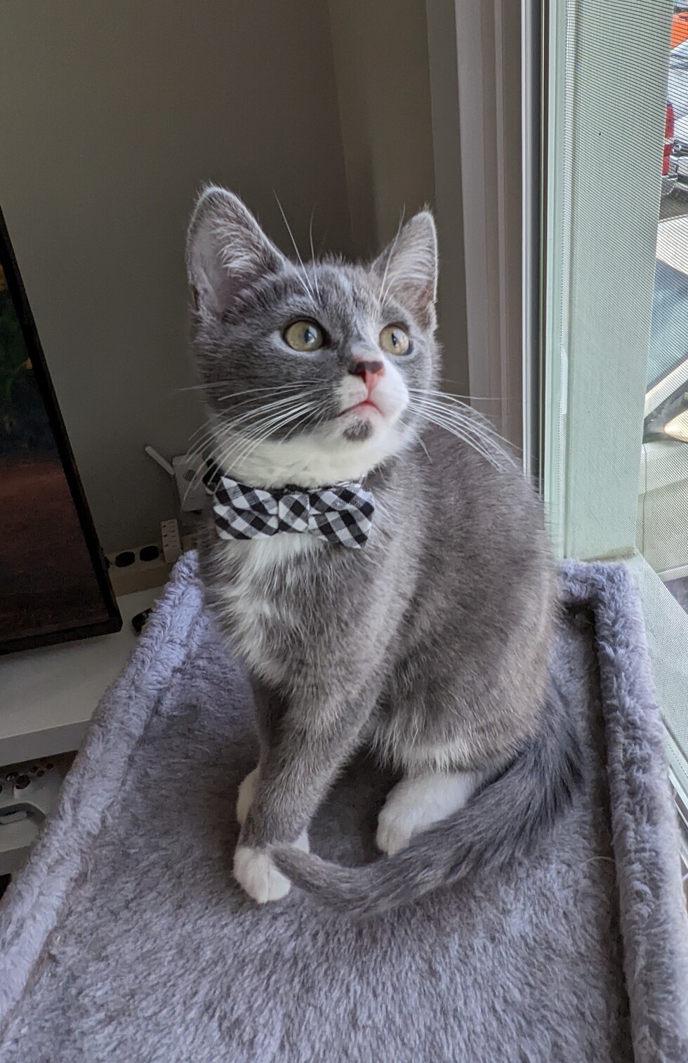 A little about me...I work with Ruby Whiskers animal rescue. In late February of 2022, I fostered a very pregnant cat named Fiona, and on March 4, Marshmallow and his 5 siblings were born! This picture was taken on the day we decided to adopt him! Marshmallow is a big boy now, and he helps us socialize every foster we bring into the house!