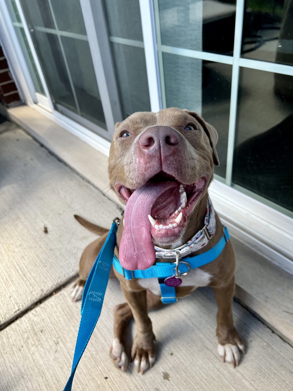 A little about me...This picture is from the day my fiancé and I rescued our foster dog Scarlett from Chicago Animal Care and Control. She was one of the 10 longest stays, (though we don’t know why!!!) and probably had a limited amount of time left. You can’t tell she’s spent time in the shelter because she always has a smile on her face, a wiggly butt, and wagging tail. Her smile is infectious, and she has a happy go lucky attitude about life! She LOVES treats, giving kisses, and rolling around showing off her adorable belly. Her paws all have white on them like they’ve been dipped in milk. Her beautiful hazel eyes will draw you in, her pink nose will give you a boop, but it’s the way she loves so freely that will make you fall in love. Scarlett will be adoptable soon through Dark Horse Dogs rescue!