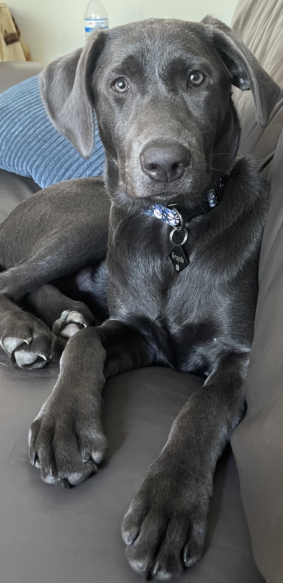 A little about me...Graycie is our sweet/sassy Charcoal Lab. Graycie loves to play with her toys and ball and throw her rather large paw your way to hold on to your arm. Still a puppy (5 months in this photo), she is learning what she can and can't get away with....mainly counter-surfing at this point because she is now tall enough to reach pretty much everything/anything she wants...we have some work ahead of us. She also enjoys sitting outside on our back patio and watching the cars and /or people go by; and really enjoyed when the cicadas were flying everywhere. Her piercing gray eyes are so very pretty and she knows how to use them. We can't wait to see how Graycie grows into a loyal, loving, protective companion and family member. She enjoys waking up her human sister each morning by jumping on the bed and giving her a BIG kiss to wake her up! They are so precious together.