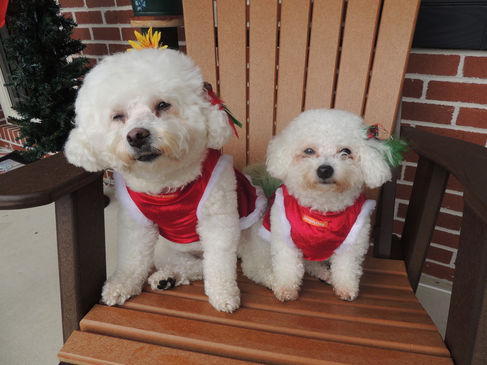 Looks like mother and daughter....Hollie Lu is 8 years old and suffers from separation anxiety so we searched and searched for another Bichon so Hollie would have a companion...so we found Susie Belle and she is 3 years old now. Hollie weighs 15 lbs and little Susie Belle weighs 6 lbs. Perfect match. Where one goes the other follows. Sweetest little dogs.