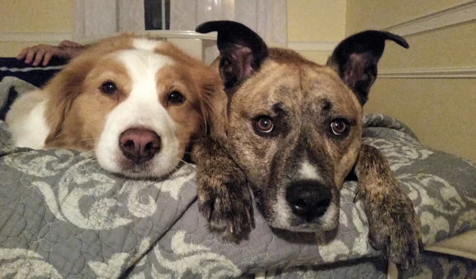 Rico (brindle) was found on the side of the road in the Cumberland area in 2011 by a friend and in need of a home. We took a chance on him and he quickly won us over with his big heart and many wet kisses. Rico became a brother when we invited Boh (white) into our family last summer when he was in need of a new home. Boh was a previous Allegany County Animal Shelter resident briefly in 2014. He was the perfect addition to our family with his contagious smile. Our home is full of love and laughter watching these two bond over walks, treats, car rides and cuddles!