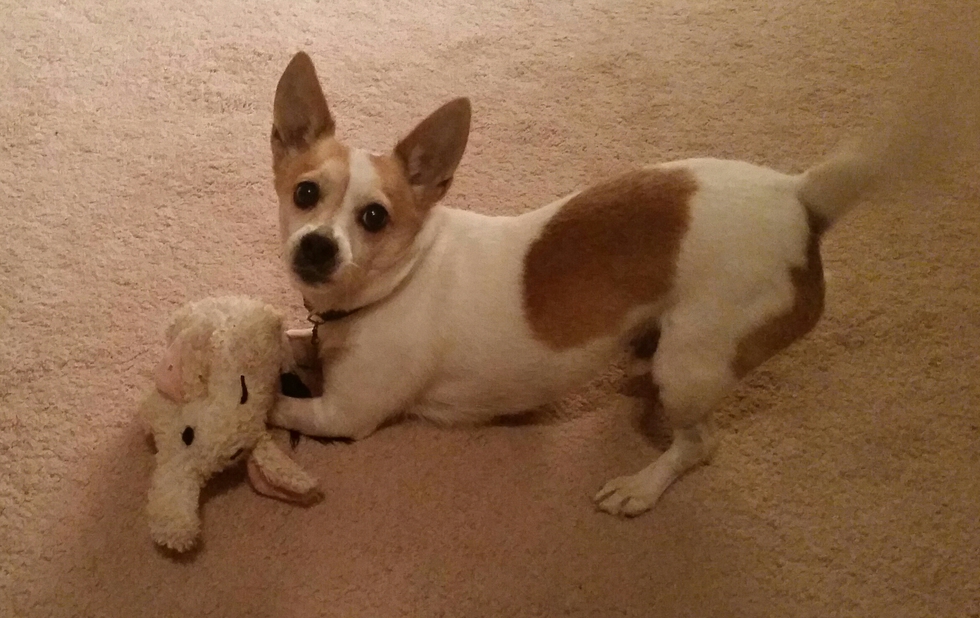 Rudy loves playing with stuffed animals and his favorite trick is jumping through a hoop! He is part Jack Russell terrier and has the speed and agility of a Jack. He's only 10 pounds, but can jump onto our bed without even a running start. When he jumps he "hangs" in the air! Rudy's favorite pass time is cuddling. He sleeps under the blankets, curled tight up against me or my husband every night. Rudy is our first small dog and he is so funny! He always makes me laugh. He also became a big brother to another shelter dog, "Mr. President," who we adopted 2 years after Rudy. "The Prez" is a 16 year old corgi mix who is deaf and partially blind. Rudy looks out for him and let's me know if something is wrong. We love Rudy and "The Prez." Adult dog adoptions rock!