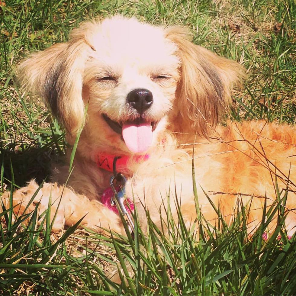 Basically, Goldie eats chicken flavored treats, and hangs with her best friend Kay dog. He shows her the ropes of this whole dog thing because she lived in a cage for the first three years of her life, and doesn't really know how to play. Goldie also LOVES grass and sunshine, like she never got to play in it or something.