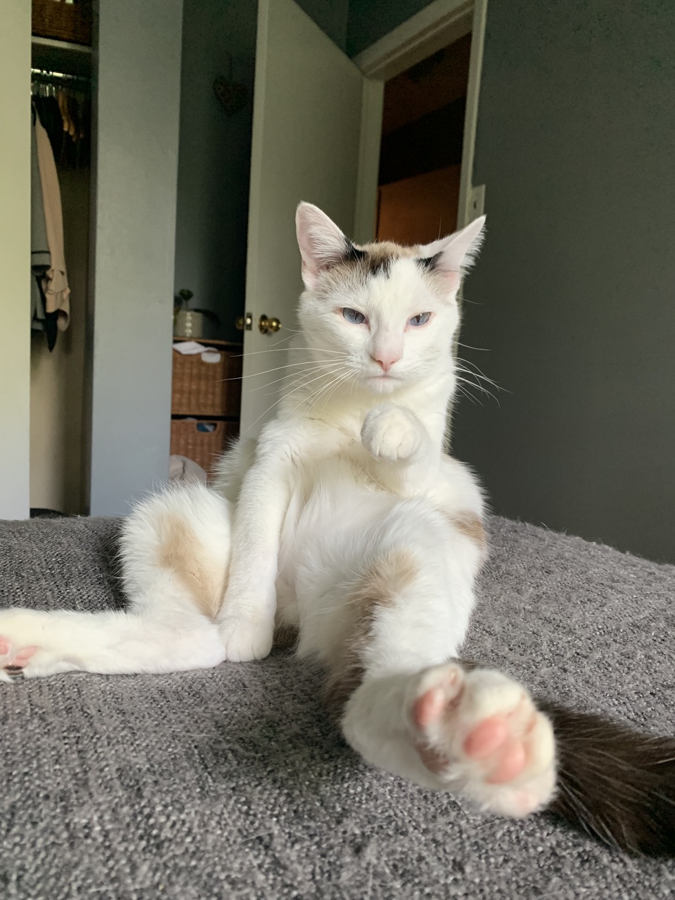 Parker was adopted from Georgian Feral Cat Committee. He was found in a flower pot outside a barn. Parker has gone through medical ups and downs but has come out on top. Parker loves to sit down like this all the time and like to also do “parkour”. He is a very funny, loving and loyal kitty. Parker has also learned tricks like; sit, spin, jump, up, down, speak and has a recall.