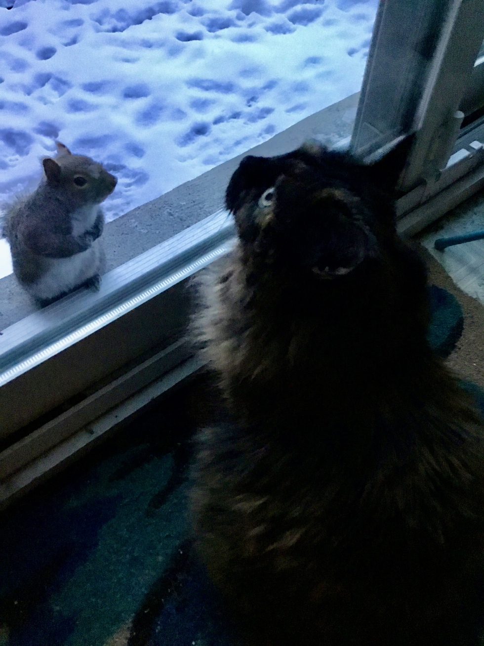 Alliston shelter rescued my Beauty from a home of 116 other cats. I saw her picture and knew she was the one to comfort me as a 24/7 caregiver of my severely ill husband. She used all her courage to trust us. One year later she is full of cuddled and talks to me all the time just like all tortoise hair cats do! Her little squirrel friend comes to the door every morning to say hello. Unlikely friends, life’s surprises.