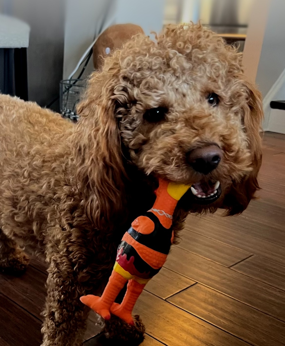 Golden doodle. He is a fun and goofy guy. He loves his chicken toys.