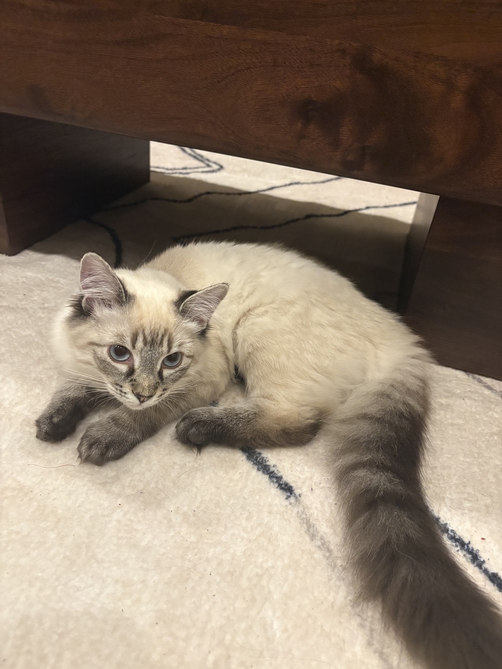 Periwinkle is a spunky 6 month old. She loves playing fetch and hiding under skirts. Her favorite toy is her little blue mouse
