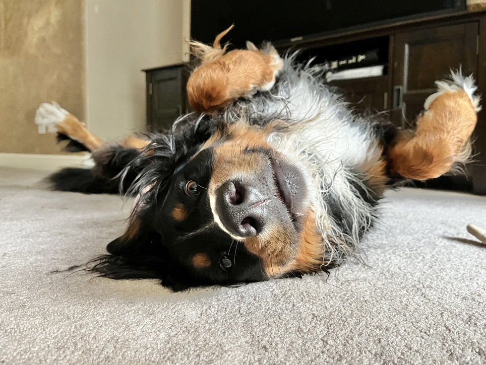 This is Clover the Bernese mix that we got from rescue. She loves people more than anything and is always up for a massage if you are nearby. She loves to relax and her “smile” shows how happy and loved she is.