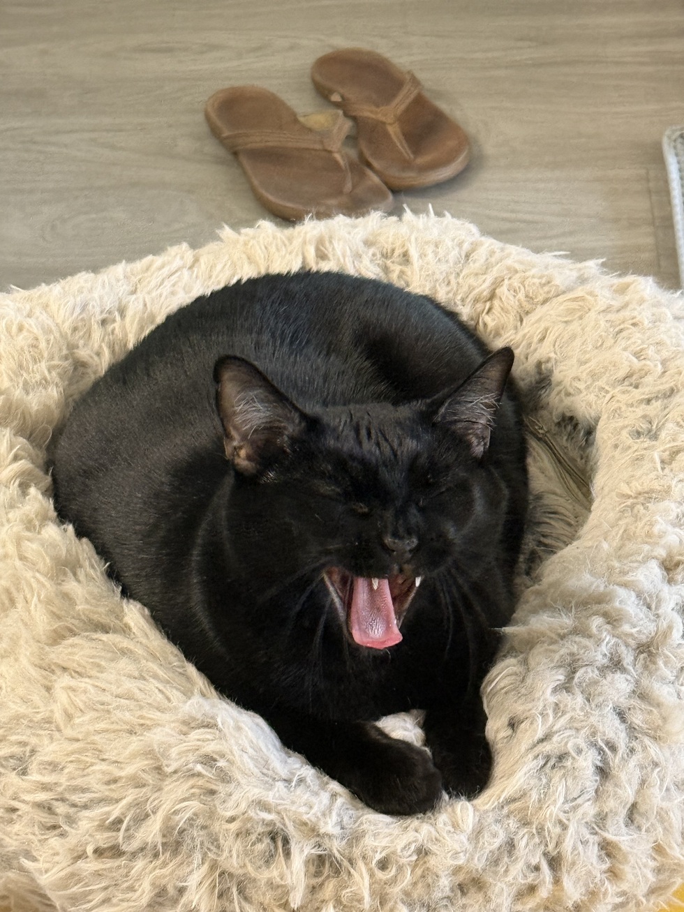 Pancake was adopted on 06/04/2025, and she has been enjoying her new kingdom with her brother, Billy Bob!! Her name was originally Thymie, but she seemed ready for a new identity. And she looks just like a little black pancake when she is curled up in bed.