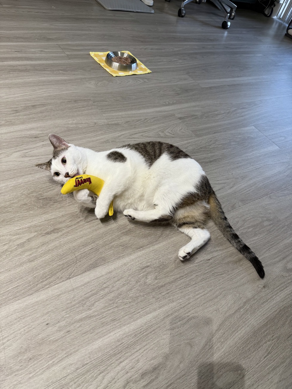 He loves flopping on the bed, showing his cute little belly, and biting his mommy! He is so loving and playful, I cannot believe he was at the shelter for so long. Now he loves looking out the window and playing with his many wand toys until he is out of breath. He tries to play with his sister, Pancake, but she will only tolerate it sometimes!