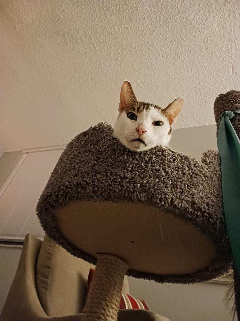 Percy is an older gentleman who was a resident of APR's "Long Shot" room for a long while before we adopted each other. He is funny & quirky. This pic was taken while I was lying on my yoga mat doing exercises. He was so mesmerized with my activity. I looked up & saw that face and of course started giggling. I have since shared his kooky expression pic with many friends who also got a kick out of it as well! This adorable senior will spend his golden years lounging on the screened balcony sunning himself and receiving lots of daily love.