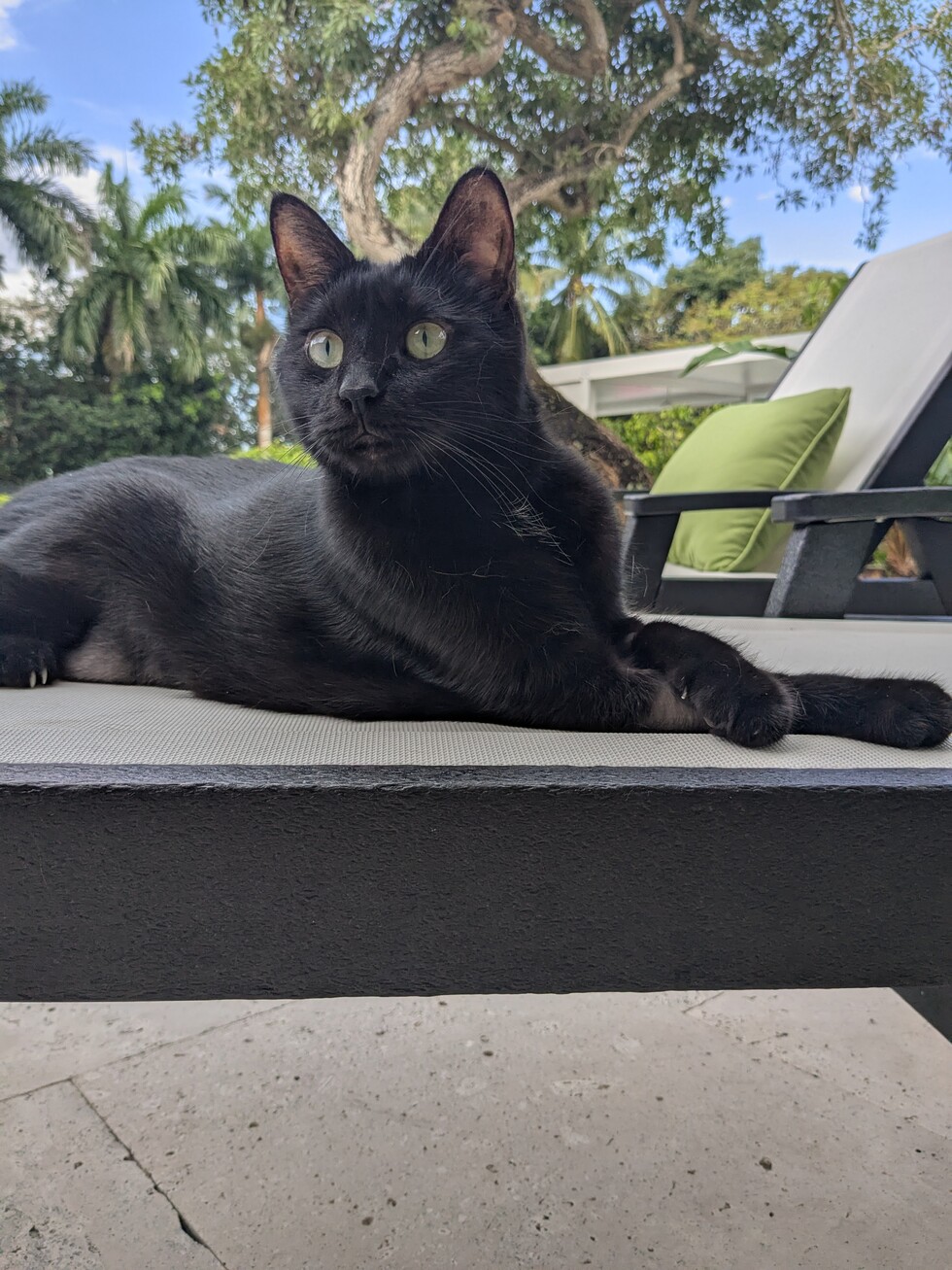 As you can see in the photo, Ron Santo loved the great outdoors! Whether he was chilling on the lounge chairs, chasing lizards, or accidentally falling in the pool (He was ok! Just a little wet 😆), he was never happier! He truly enjoyed when I took him outside and gave him head and ear scratches. He would meow at me and I would meow back—we both enjoyed our conversations (haha)!
