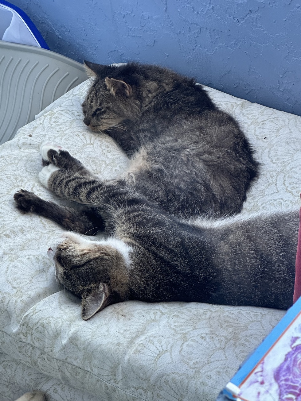 Bob and White-foot are resident TNR strays at our house. Street life is a hard life, so we do what we can to provide care and comfort. These two love the catnip cushions.