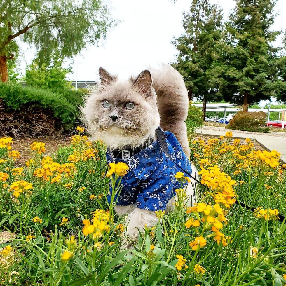 Earl has feline immunodeficiency virus, so he doesn't spend much time outdoors — but he LOVES taking on-leash walks around the neighborhood when we let him. He's just an all-around one-of-a-kind cat and we're so glad ARF was able to introduce him into our lives.