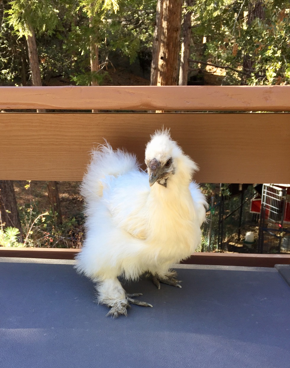 Betty White is a Silkie chicken who lives up to her name and does not take nonsense from her coop sisters. She prefers to sunbathe and enjoy the finer fruits and vegetables in life.