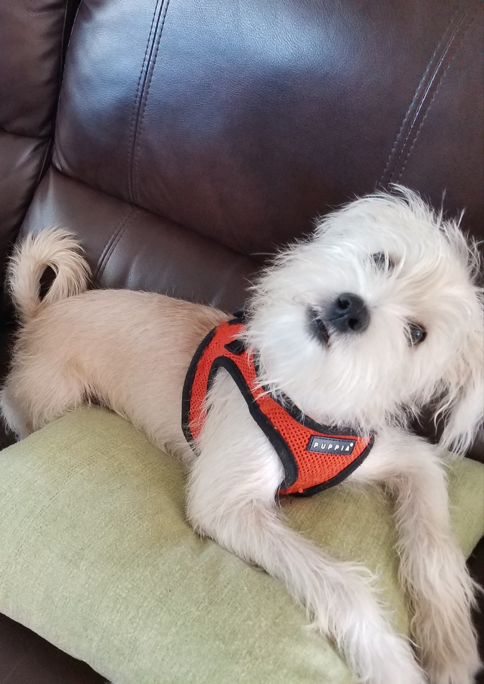 Pet's Story or BioARF posted an adorable photo on Facebook of this tiny, white little puppy who was the last of his litter to be adopted. He was part of the "Big Bang" litter.  ARF named him "Leonard," because he was the most mellow one in the litter. Our friend Andrew contacted me because he thought this adorable little guy would fit perfectly in our family. Once Dolores and I saw the FB post, it was love at first sight! With Andrew’s help, we adopted him the next day. The Facebook posting said about Leonard (now “Eddie”), “He is a very mellow puppy - not much for biting and chewing, and pretty darned quiet!” That was before we brought him home! He has the energy of 10 puppies, and immediately found our dogs' toy basket and removed every toy (at least 20), and ended up falling asleep in the basket. Eddie has turned out to be one of the most loving, affectionate dogs we have ever had. He is a handful, but each day, he brings us more laughter and joy than we ever expected. Just prior to  adopting Eddie, we laid Dolores' elderly dog, Paris, to rest. Dolores adopted Paris from ARF many years ago and was devastated by the loss. Thankfully, with the arrival of Eddie and the love of our other "kids," Ming and Junior, her heart began heal.