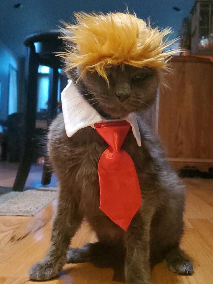 Angel is 18 years old and loves to sit with my dad on his lap while he watches Fox News, and so I felt it was only fitting to dress her up as Donald Trump! (She prefers to stay out of any politics, but she was a good sport and wore the costume for her photo shoot.) Angel was found as a stray kitten out back behind the barn and has been with us ever since.