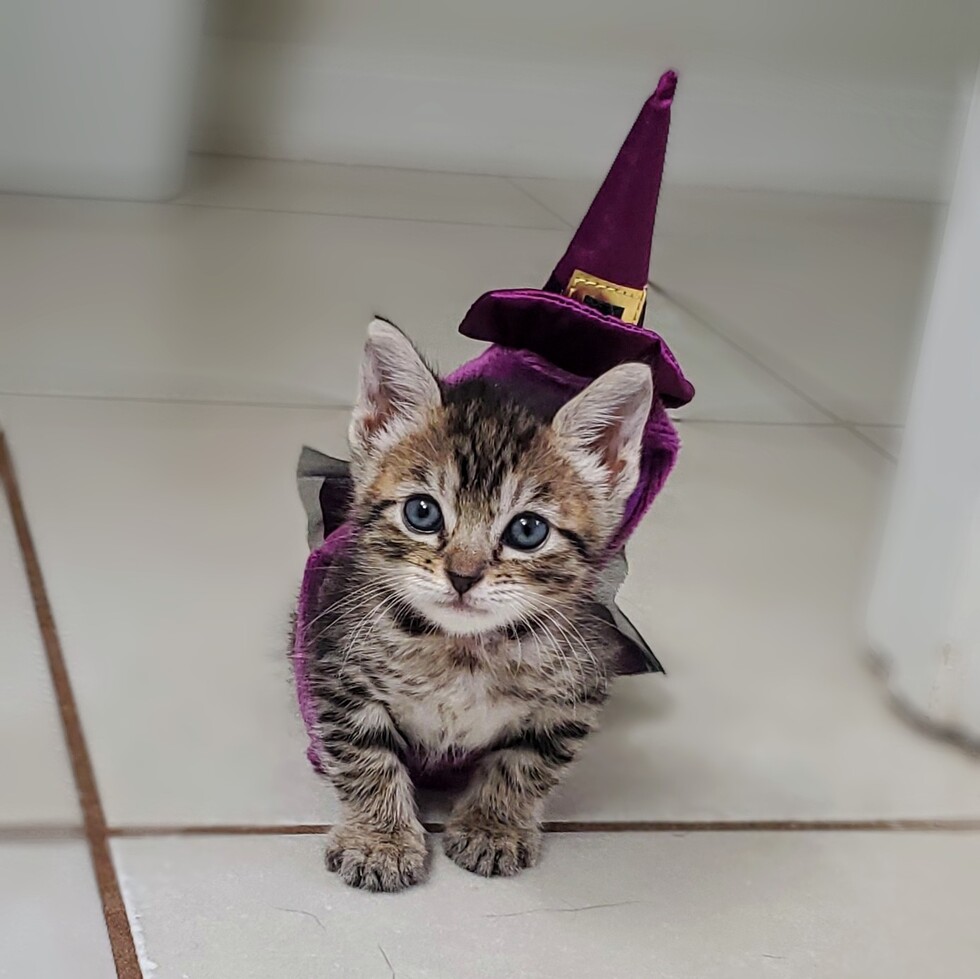 Finders was one of two 2.4oz kittens thrown in a garbage can at a local gas station. Her sister, Keepers, only lived three hours after we got her. Our organization, A HOPE, has raised this girl who is now the most spunky little 5 week old you have ever met. She will be available for adoption soon and she will be the perfect addition to any family. Her only downside? Her purrs are extremely loud so when she sneaks up to pounce, she gives herself away! She chose this witch costume because it was made for bearded dragons yet she knew it was truly made for her. Challenge accepted.