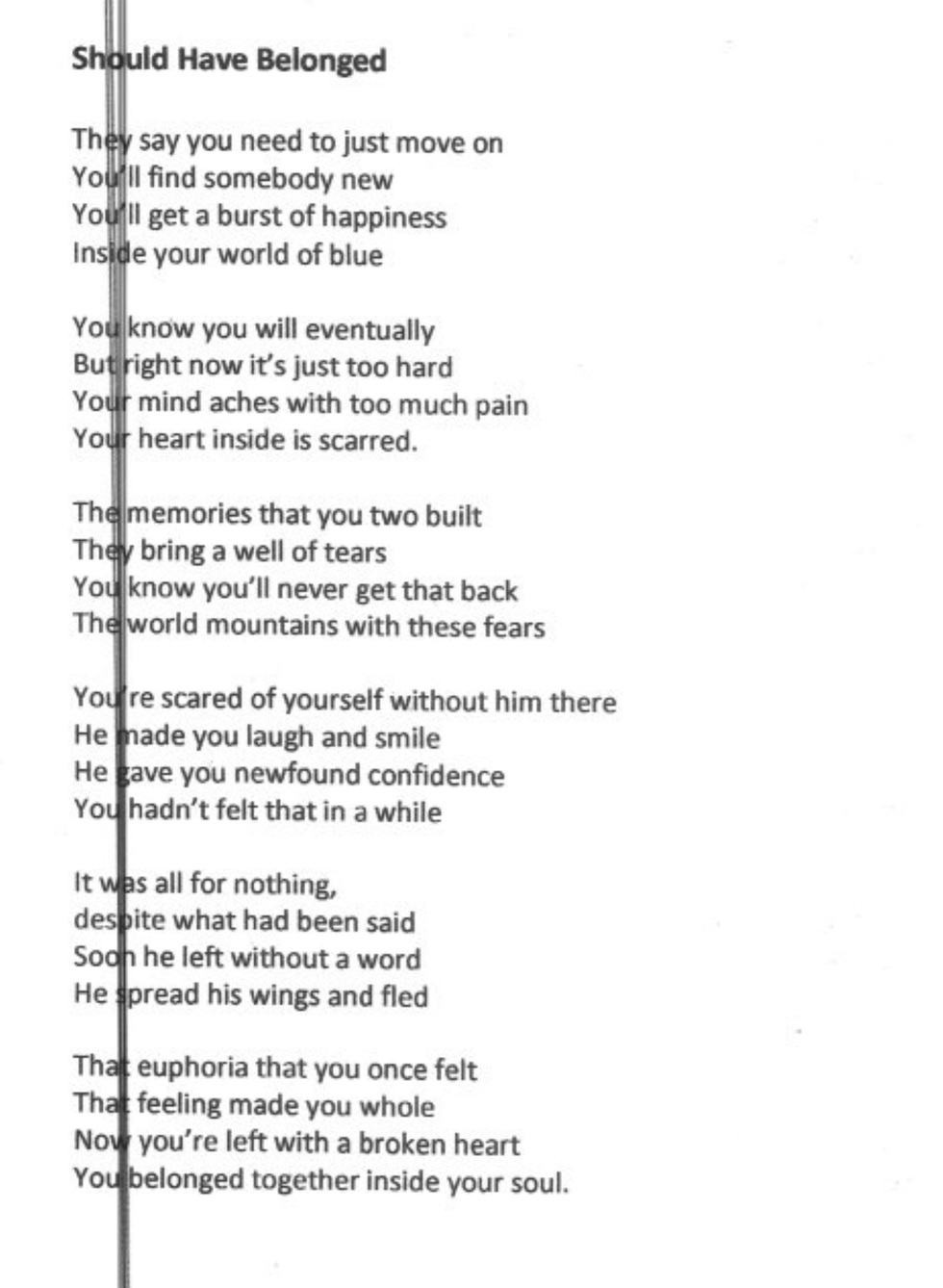 Artist StatementArt has impacted my life drastically, especially the dramatic arts and written works. I love to write, especially in a notebook, and will write about anything that comes to mind. I love looking at paintings and finding their hidden messages. I love to sing and perform onstage. All of this has helped me find a way to share my voice and brought a new confidence to me through extremely difficult times.