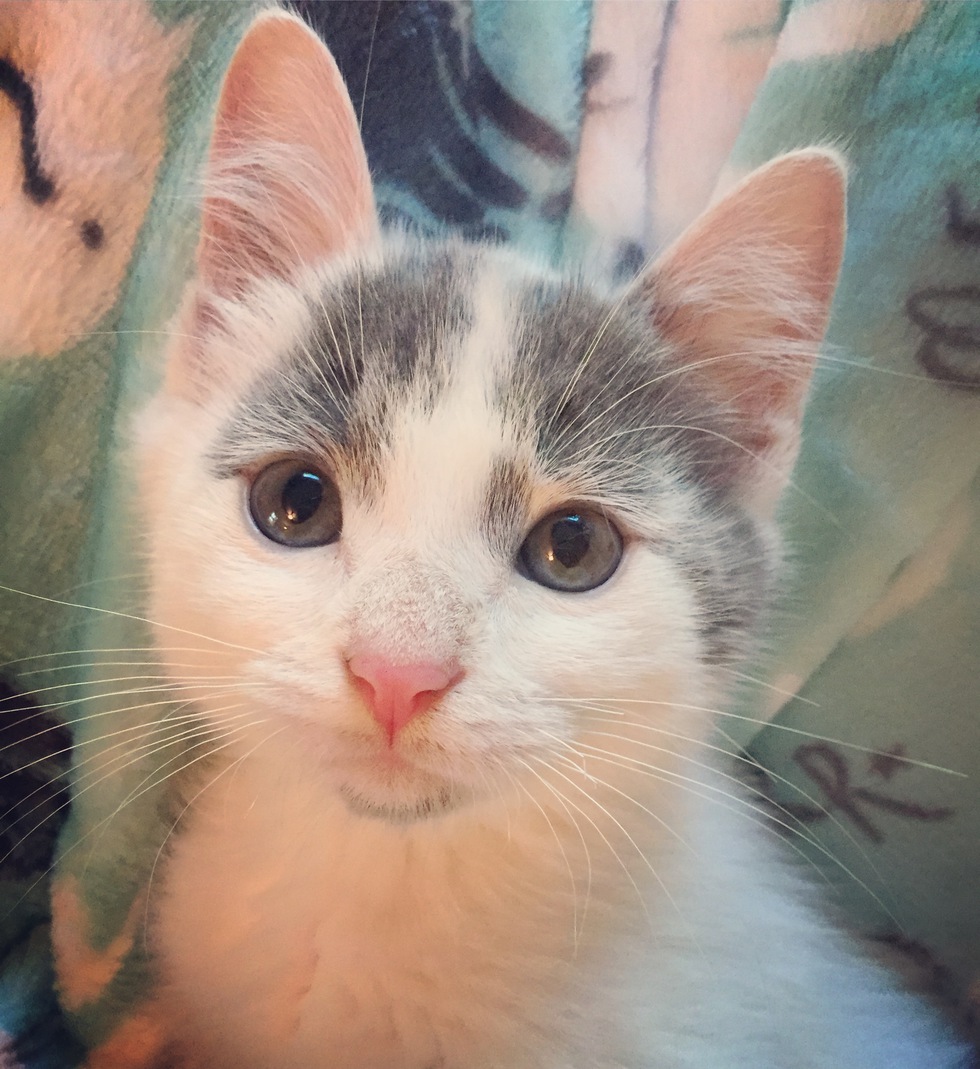 My husband Brayden and I were on our way home from camping when we spotted a white fur ball blowing down the 4-lane highway, just a mile from our house. It took a minute to realize that this tiny tumbling thing was alive. We did a U-turn and saw a kitten perched in the middle of the road with three cars quickly approaching. As we watched in horror from the median, Brayden laid on the horn and the nearest car swerved to narrowly miss the kitten as he scurried to the grass.